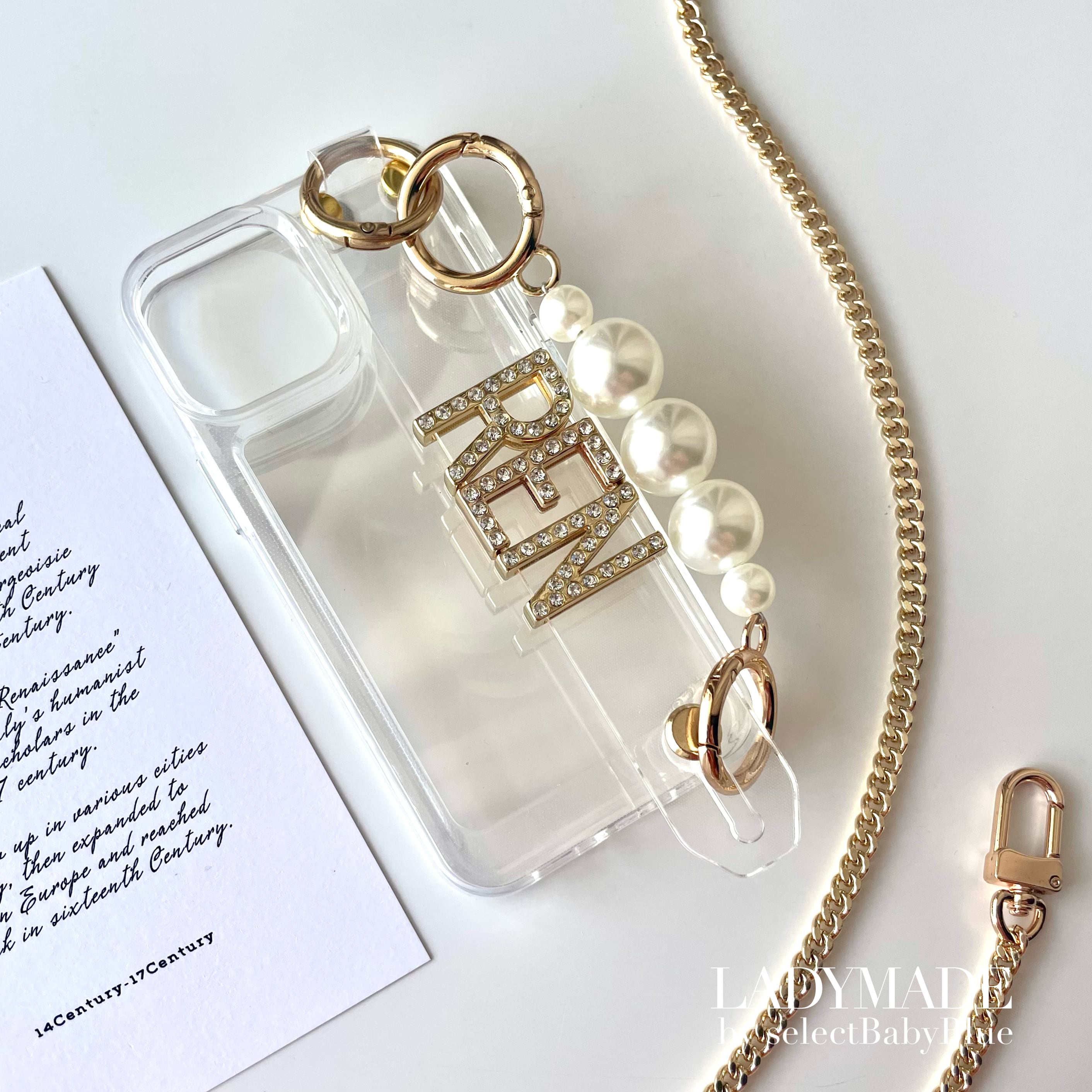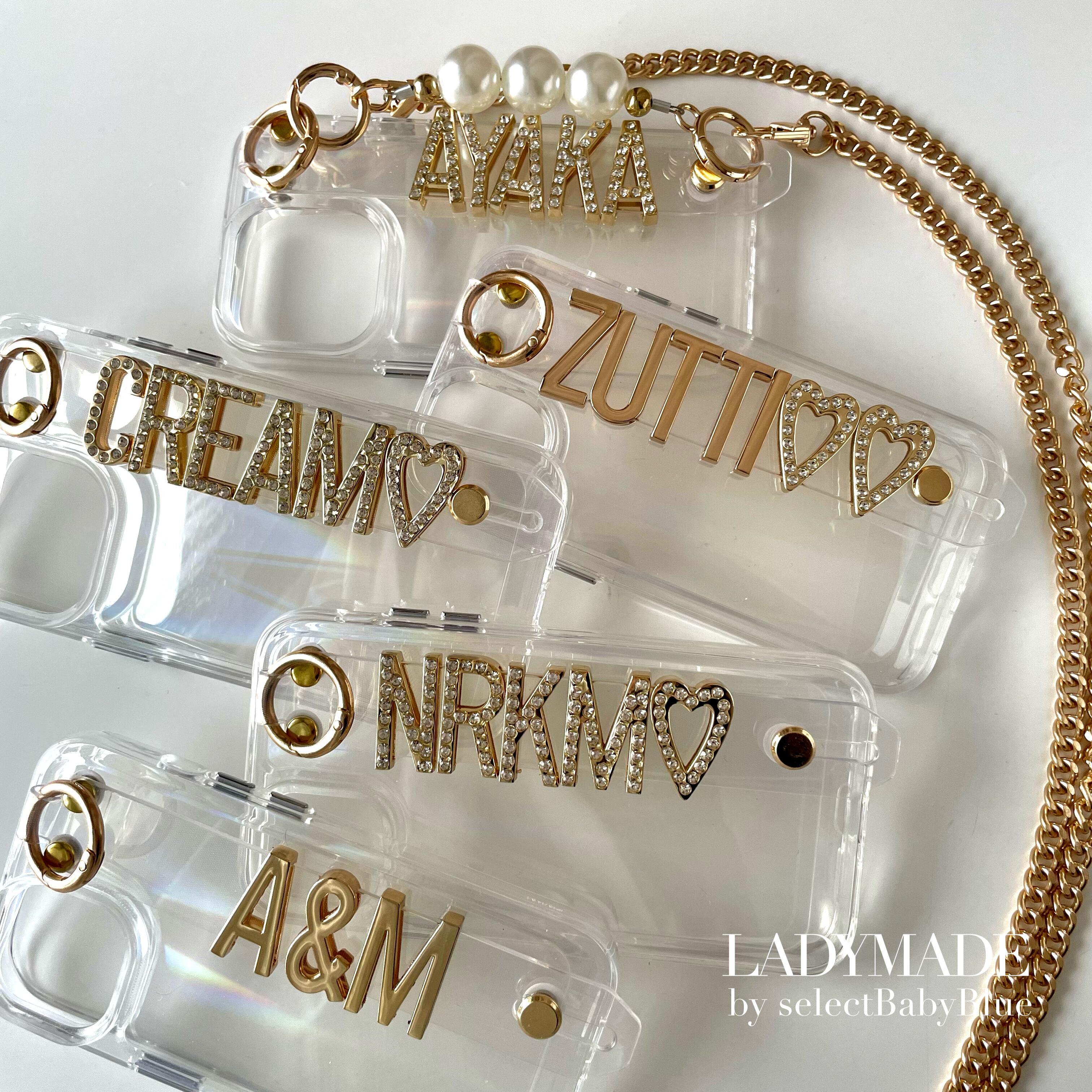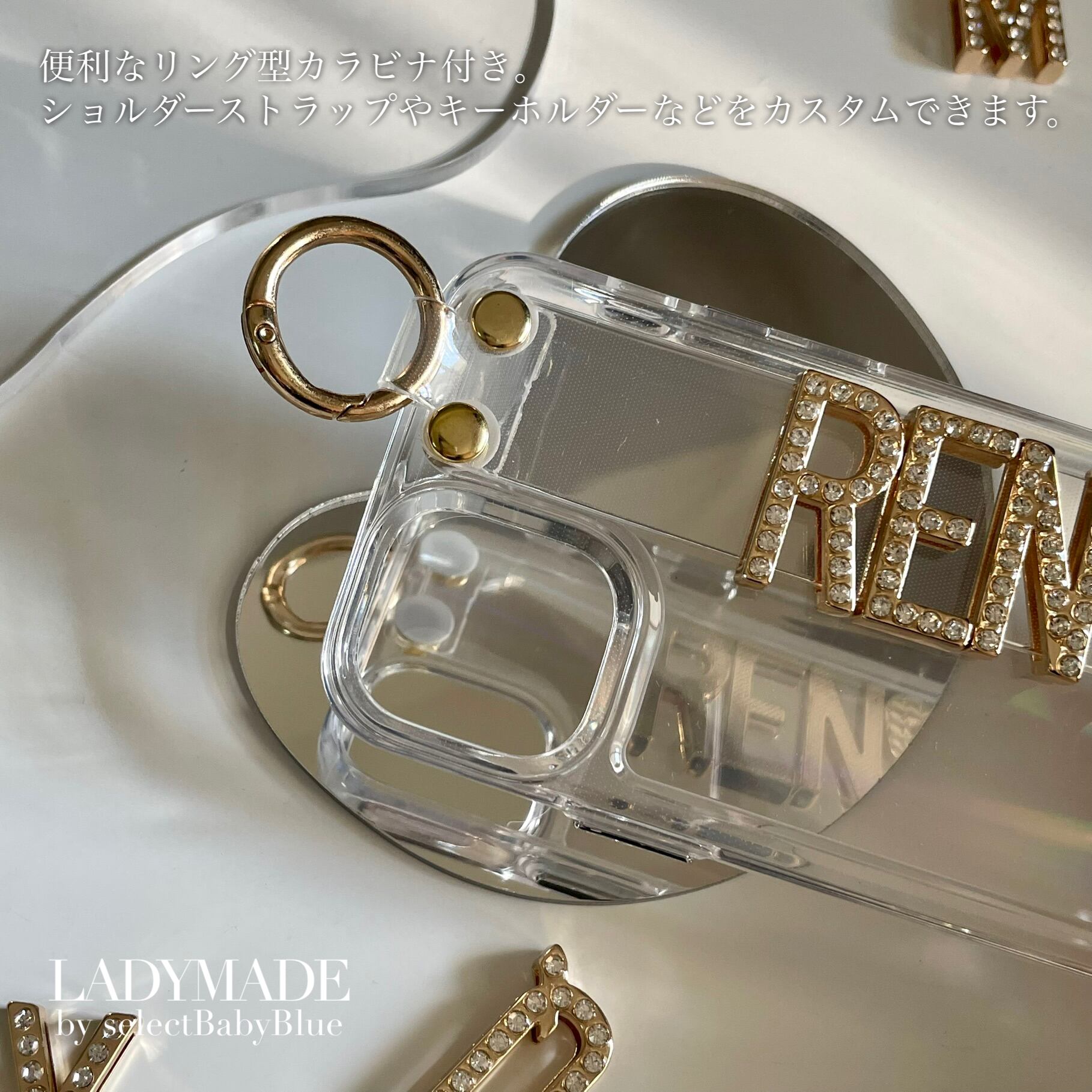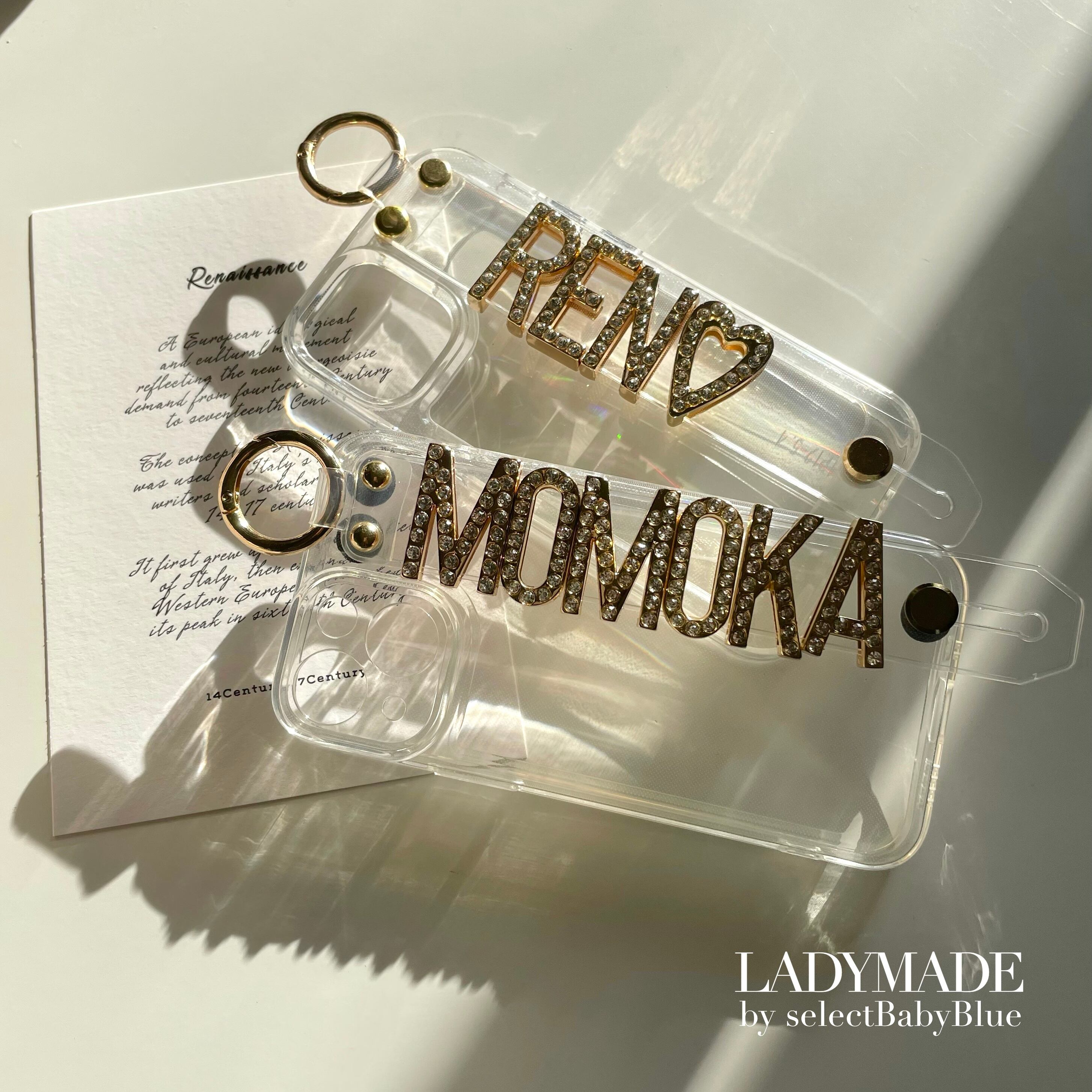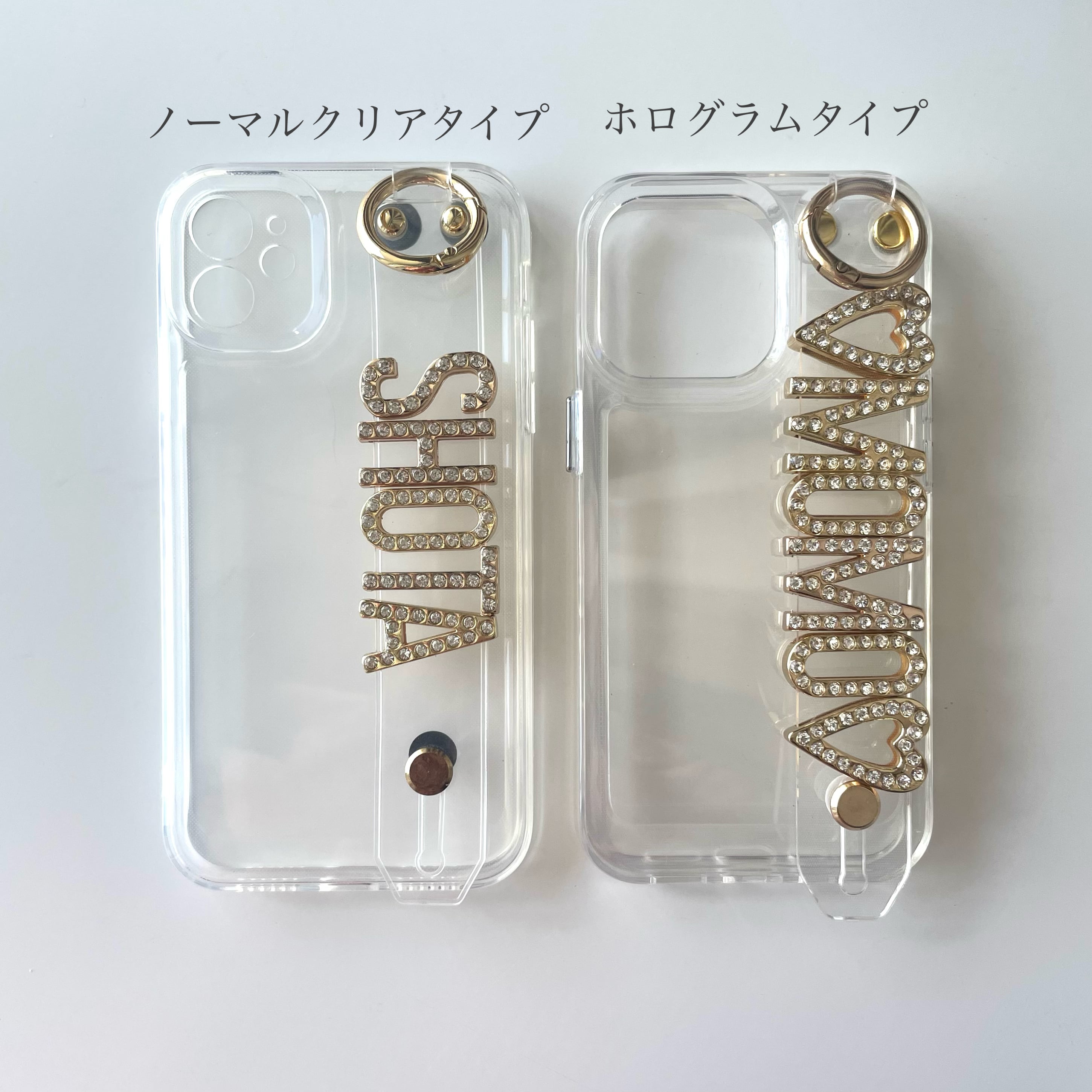 ハンドストラップにアルファベットチャームがカスタムできる、硬質プラスチック製クリアスマホケースです。