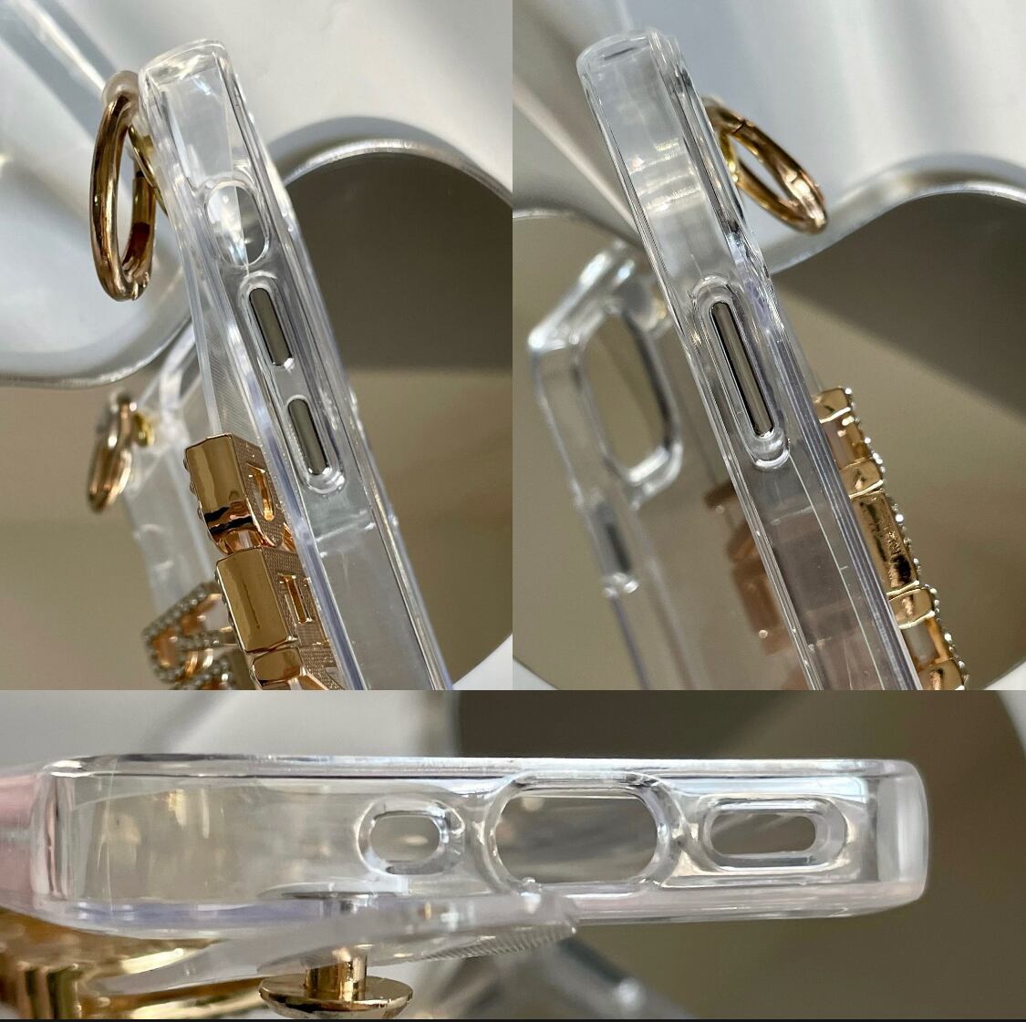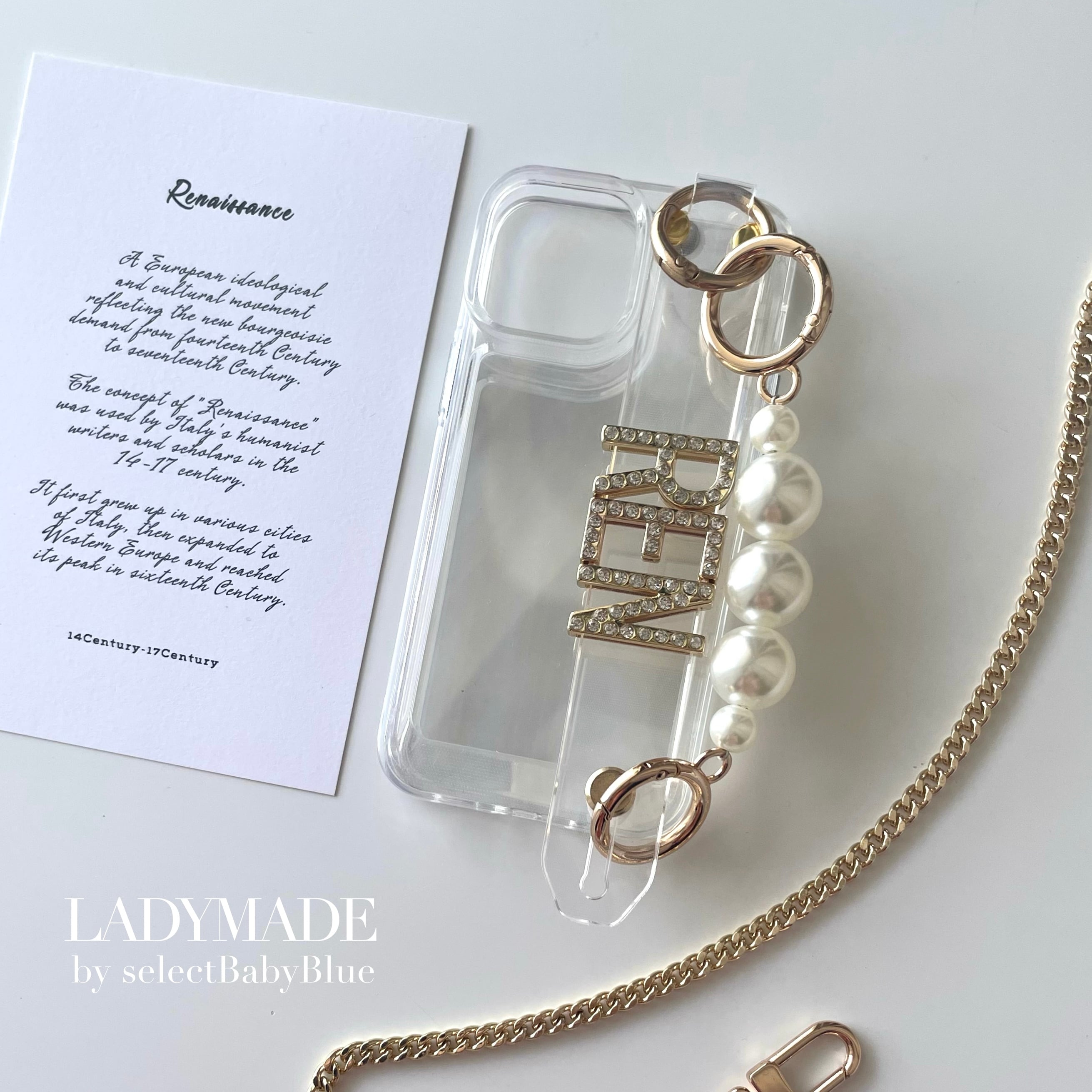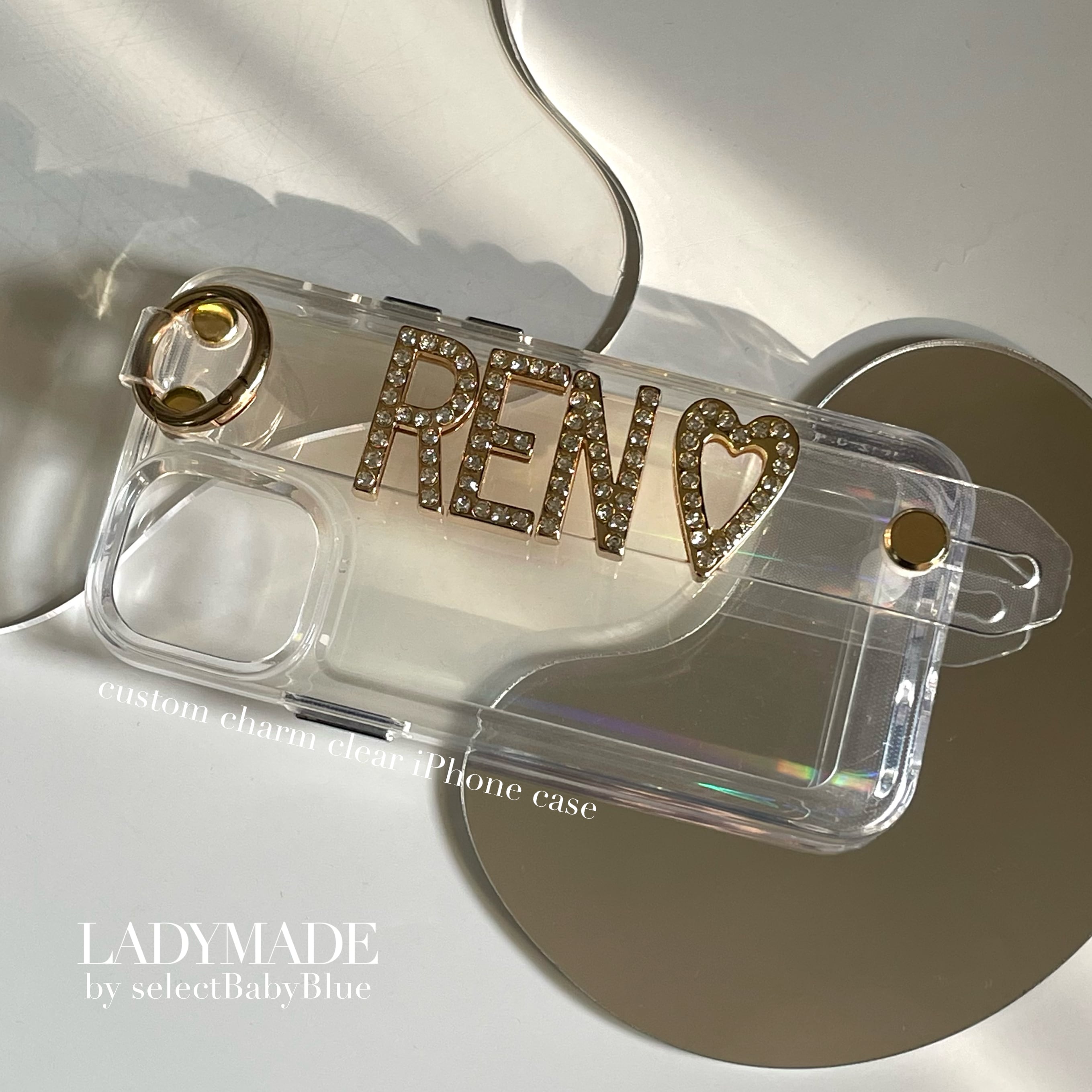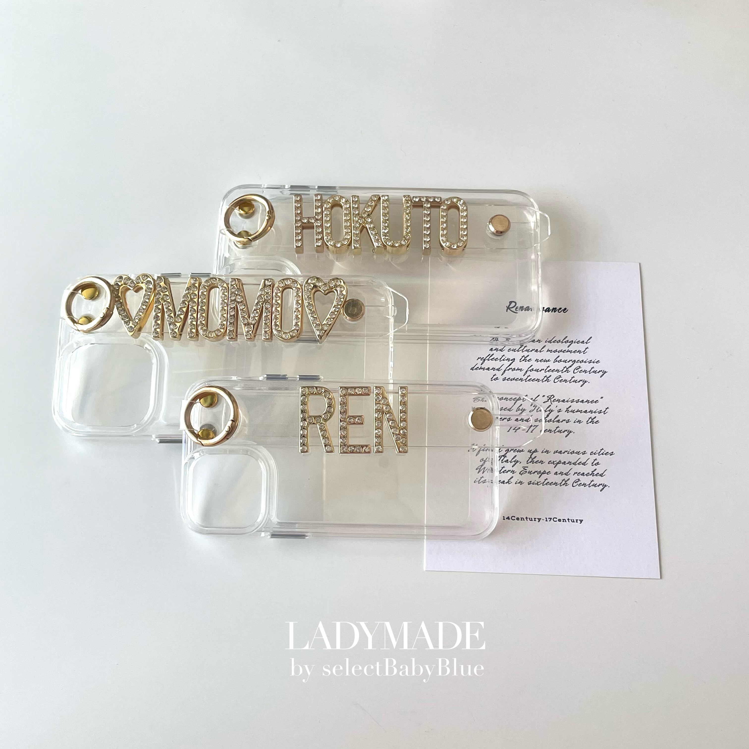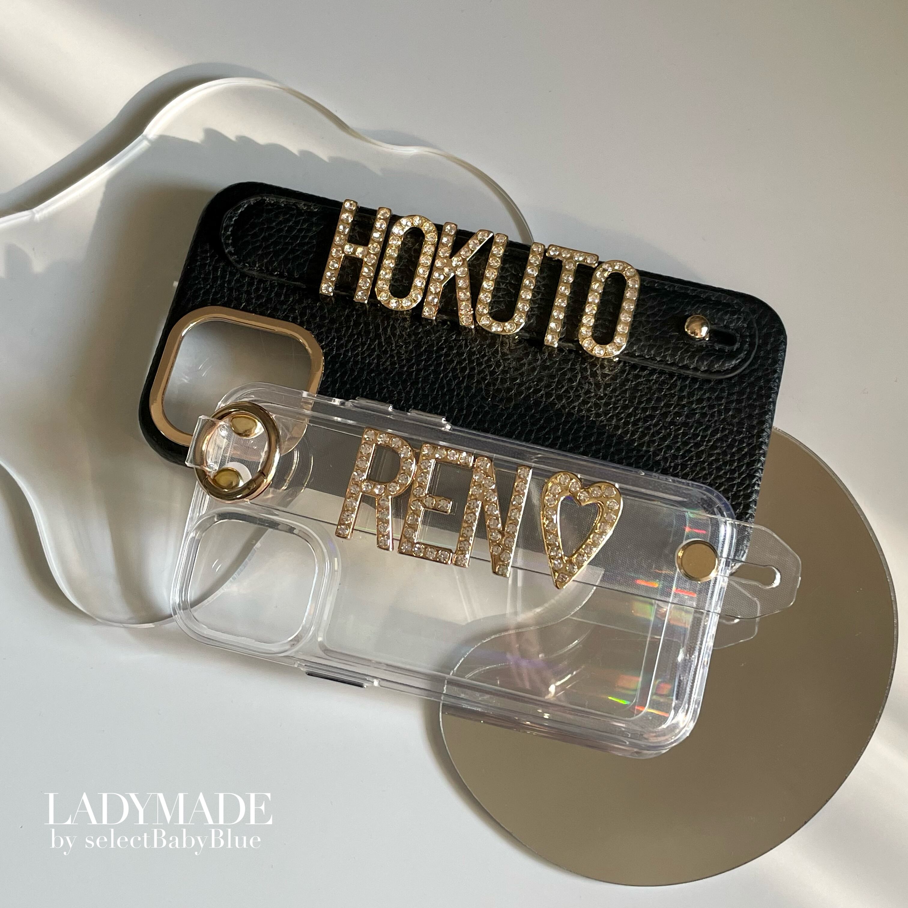 ハンドストラップにアルファベットチャームがカスタムできる、硬質プラスチック製クリアスマホケースです。